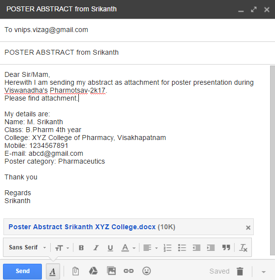 Abstract: Not more than 250 words in MS Word file has to be submitted to vnips.vizag@gmail.com with names of author and co-author, college name, corresponding author e-mail id and subject category on the top of abstract.